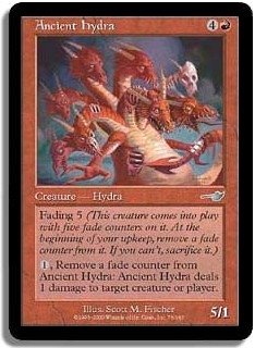Fading 5 (This creature comes into play with five fade counters on it. At the beginning of your upkeep remove a fade counter from it. If you can't sacrifice it.) 1 Remove a fade counter from Ancient Hydra: Ancient Hydra deals 1 damage to target creature or player.
