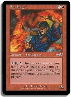 2R T Discard a card from your hand: Arc Mage deals 2 damage divided as you choose among any number of target creatures and/or players.