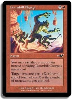 You may sacrifice a mountain rather than pay Downhill Charge's mana cost. Target creature gets +X/+0 until end of turn where X is the number of mountains you control.