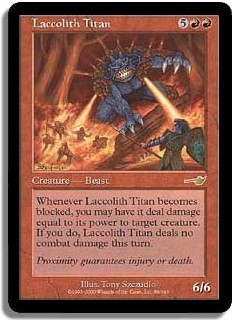 Whenever Laccolith Titan becomes blocked you may have it deal damage equal to its power to target creature. If you do Laccolith Titan deals no combat damage this turn.