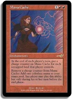 At the end of each player's turn put a charge counter on Mana Cache for each untapped land that player controls. Remove a charge counter from Mana Cache: Add one colorless mana to your mana pool. Any player may play this ability but only during his or her turn before the end phase.
