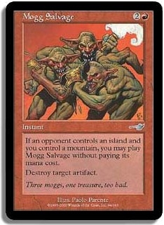 If an opponent controls an island and you control a mountain you may play Mogg Salvage without paying its mana cost. Destroy target artifact.