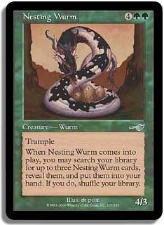 Trample When Nesting Wurm comes into play you may search your library for up to three cards named Nesting Wurm reveal them and put them into your hand. If you do shuffle your library.