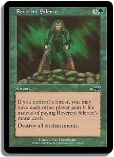 If you control a forest you may have each other player gain 6 life rather than pay Reverent Silence's mana cost. Destroy all enchantments.