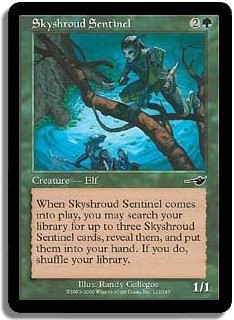 When Skyshroud Sentinel comes into play you may search your library for up to three cards named Skyshroud Sentinel reveal them and put them into your hand. If you do shuffle your library.