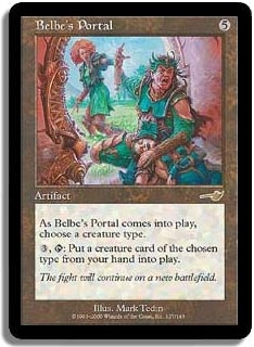 As Belbe's Portal comes into play choose a creature type. 3 T: Put a creature card of the chosen type from your hand into play.