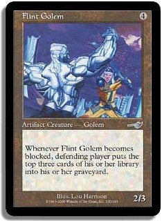 Whenever Flint Golem becomes blocked defending player puts the top three cards from his or her library into his or her graveyard.