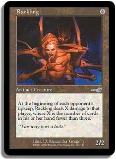 At the beginning of each opponent's upkeep Rackling deals X damage to that player where X is the number of cards in his or her hand fewer than three.