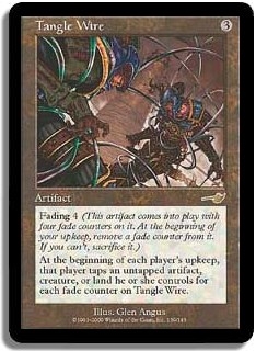 Fading 4 (This artifact comes into play with four fade counters on it. At the beginning of your upkeep remove a fade counter from it. If you can't sacrifice it.) At the beginning of each player's upkeep that player taps an untapped artifact creature or land he or she controls for each fade counter on Tangle Wire.