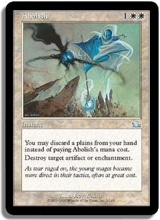 You may discard a plains from your hand rather than pay Abolish's mana cost. Destroy target artifact or enchantment.