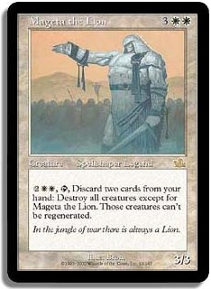 2WW T Discard two cards from your hand: Destroy all creatures except for Mageta the Lion. Those creatures can't be regenerated.