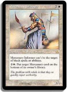 Mercenary Informer can't be the target of black spells or abilities from a black source. 2W: Put target Mercenary on the bottom of its owner's library.