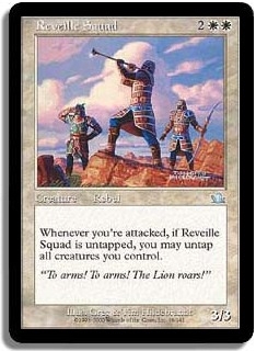 Whenever you're attacked if Reveille Squad is untapped you may untap all creatures you control.