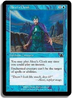 You may play Alexi's Cloak any time you could play an instant. Enchanted creature can't be the target of spells or abilities.