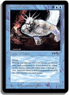 Flying. During your upkeep, you must choose one of your own lands and destroy it. If you destroy an island in this manner, Serendib Djinn does 3 damage to you. Serendib Djinn is destroyed immediately if at any time you have no land in play.