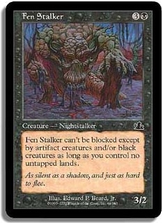 Fen Stalker can't be blocked except by artifact creatures and/or black creatures as long as you control no untapped lands.