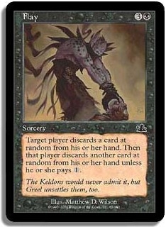Target player discards a card at random from his or her hand. Then that player discards another card at random from his or her hand unless he or she pays 1.