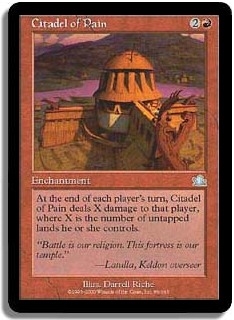 At the end of each player's turn Citadel of Pain deals X damage to that player where X is the number of untapped lands he or she controls.