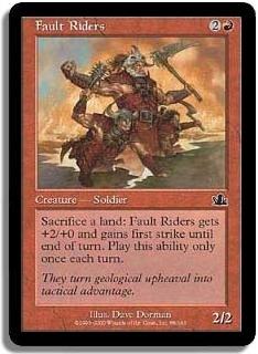 Sacrifice a land: Fault Riders gets +2/+0 and gains first strike until end of turn. Play this ability only once each turn.