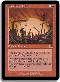 You may play Latulla's Orders any time you could play an instant. Whenever enchanted creature deals combat damage to defending player you may destroy target artifact that player controls.