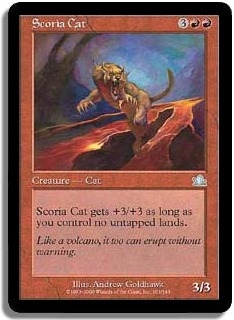 Scoria Cat gets +3/+3 as long as you control no untapped lands.