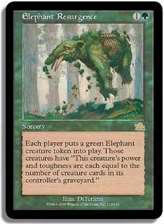 Each player puts a green Elephant creature token into play. Those creatures have "This creature's power and toughness are each equal to the number of creature cards in its controller's graveyard."