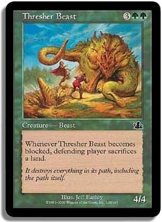 Whenever Thresher Beast becomes blocked defending player sacrifices a land.
