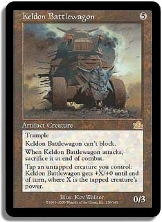 Trample Keldon Battlewagon can't block. When Keldon Battlewagon attacks sacrifice it at end of combat. Tap an untapped creature you control: Keldon Battlewagon gets +X/+0 until end of turn where X is the tapped creature's power.