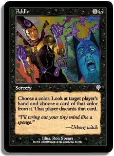 Choose a color. Target player reveals his or her hand then you choose a card of that color from it. That player discards that card.