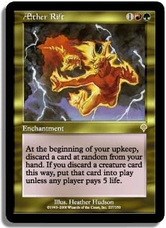 At the beginning of your upkeep discard a card at random from your hand. If you discard a creature card this way put that card into play unless any player pays 5 life.