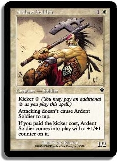 Kicker 2 (You may pay an additional 2 as you play this spell.) Attacking doesn't cause Ardent Soldier to tap. If you paid the kicker cost Ardent Soldier comes into play with a +1/+1 counter on it.