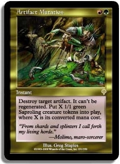 Destroy target artifact. It can't be regenerated. Put X 1/1 green Saproling creature tokens into play where X is its converted mana cost.