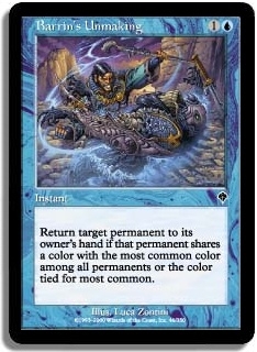 Return target permanent to its owner's hand if that permanent shares a color with the most common color among all permanents or the color tied for most common.