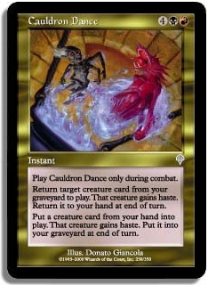 Play Cauldron Dance only during combat. Return target creature card from your graveyard to play. That creature gains haste. Return it to your hand at end of turn. Put a creature card from your hand into play. That creature gains haste. Put it into your graveyard at end of turn.