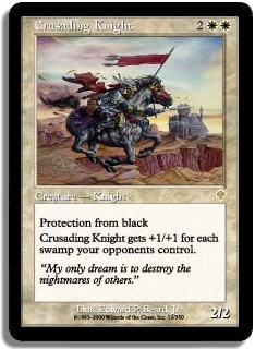 Protection from black Crusading Knight gets +1/+1 for each swamp your opponents control.