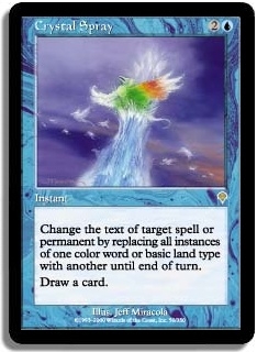 Change the text of target spell or permanent by replacing all instances of one color word or basic land type with another until end of turn. Draw a card.