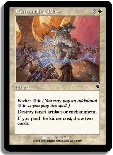 Kicker 2U (You may pay an additional 2U as you play this spell.) Destroy target artifact or enchantment. If you paid the kicker cost draw two cards.