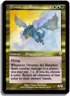 Flying Whenever Dromar the Banisher deals combat damage to a player you may pay 2U. If you do choose a color. Return all creatures of that color to their owners' hands.
