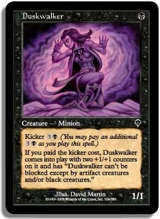 Kicker 3B (You may pay an additional 3B as you play this spell.) If you paid the kicker cost Duskwalker comes into play with two +1/+1 counters on it and with "Duskwalker can't be blocked except by artifact creatures and/or black creatures."