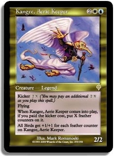 Kicker 2X (You may pay an additional 2X as you play this spell.) Flying When Kangee Aerie Keeper comes into play if you paid the kicker cost put X feather counters on it. All Birds get +1/+1 for each feather counter on Kangee Aerie Keeper.