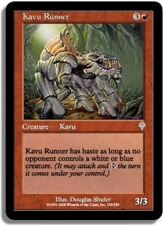 Kavu Runner has haste as long as no opponent controls a white or blue creature. (It may attack and T the turn it comes under your control.)
