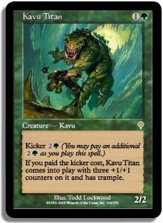 Kicker 2G (You may pay an additional 2G as you play this spell.) If you paid the kicker cost Kavu Titan comes into play with three +1/+1 counters on it and with trample.