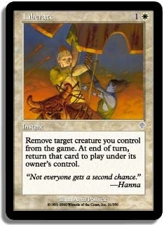 Remove target creature you control from the game. At end of turn return that card to play under its owner's control.