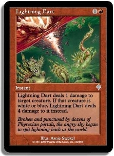 Lightning Dart deals 1 damage to target creature. If that creature is white or blue Lightning Dart deals 4 damage to it instead.