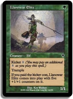 Kicker 8 (You may pay an additional 8 as you play this spell.) Trample If you paid the kicker cost Llanowar Elite comes into play with five +1/+1 counters on it.