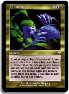 Target player reveals his or her hand then you choose a card other than a basic land card from it. Search that player's graveyard hand and library for all cards with the same name as the chosen card and remove them from the game. Then that player shuffles his or her library.