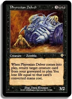 When Phyrexian Delver comes into play return target creature card from your graveyard to play. You lose life equal to that card's converted mana cost.