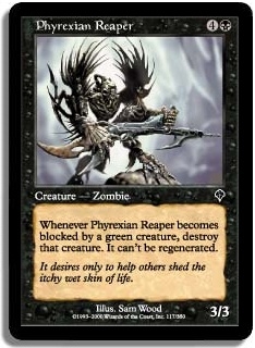 Whenever Phyrexian Reaper becomes blocked by a green creature destroy that creature. It can't be regenerated.