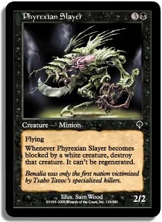 Flying Whenever Phyrexian Slayer becomes blocked by a white creature destroy that creature. It can't be regenerated.