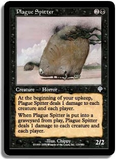 At the beginning of your upkeep Plague Spitter deals 1 damage to each creature and each player. When Plague Spitter is put into a graveyard from play Plague Spitter deals 1 damage to each creature and each player.